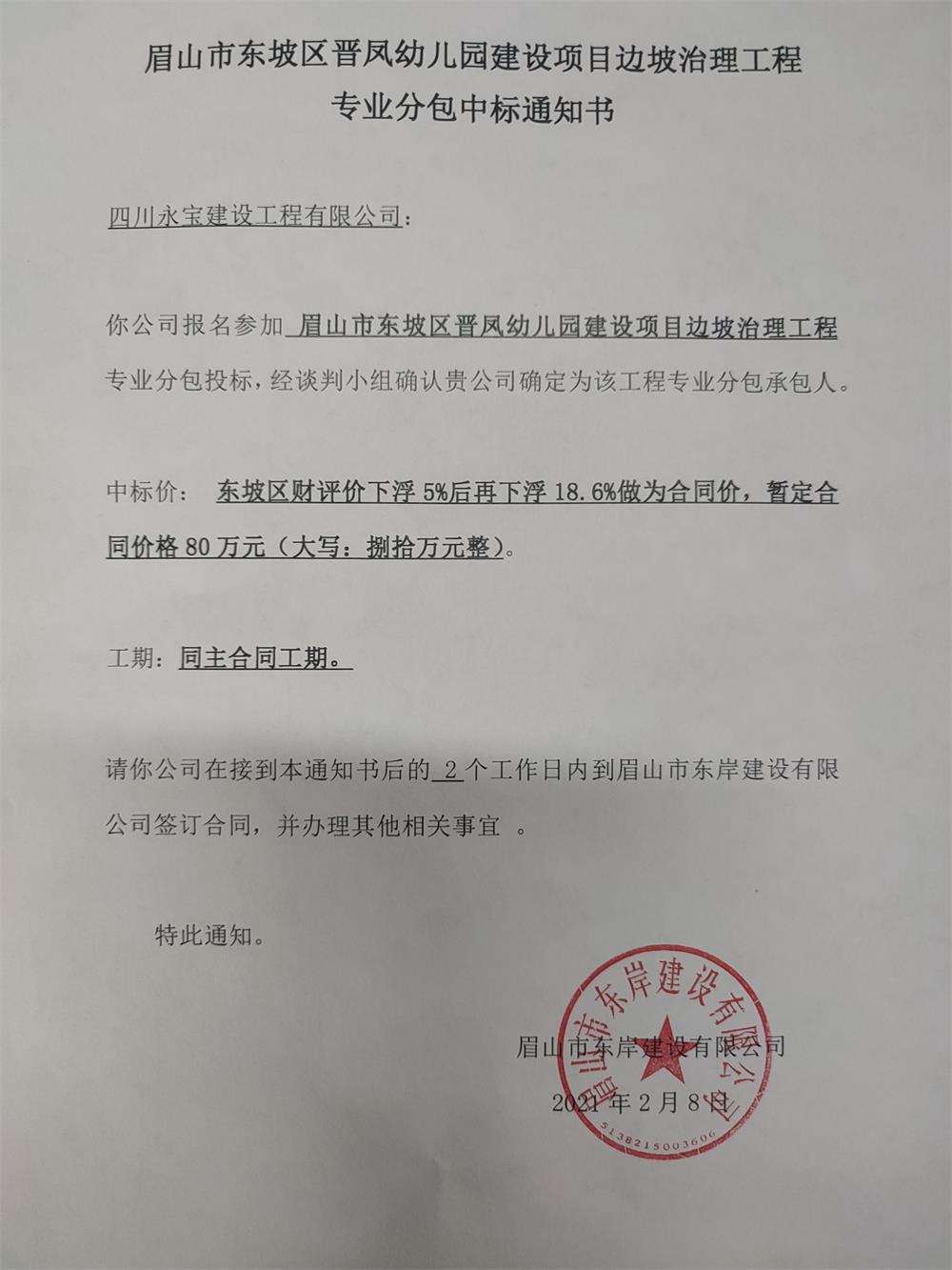 晉鳳擋墻專業(yè)分包中標(biāo)通知